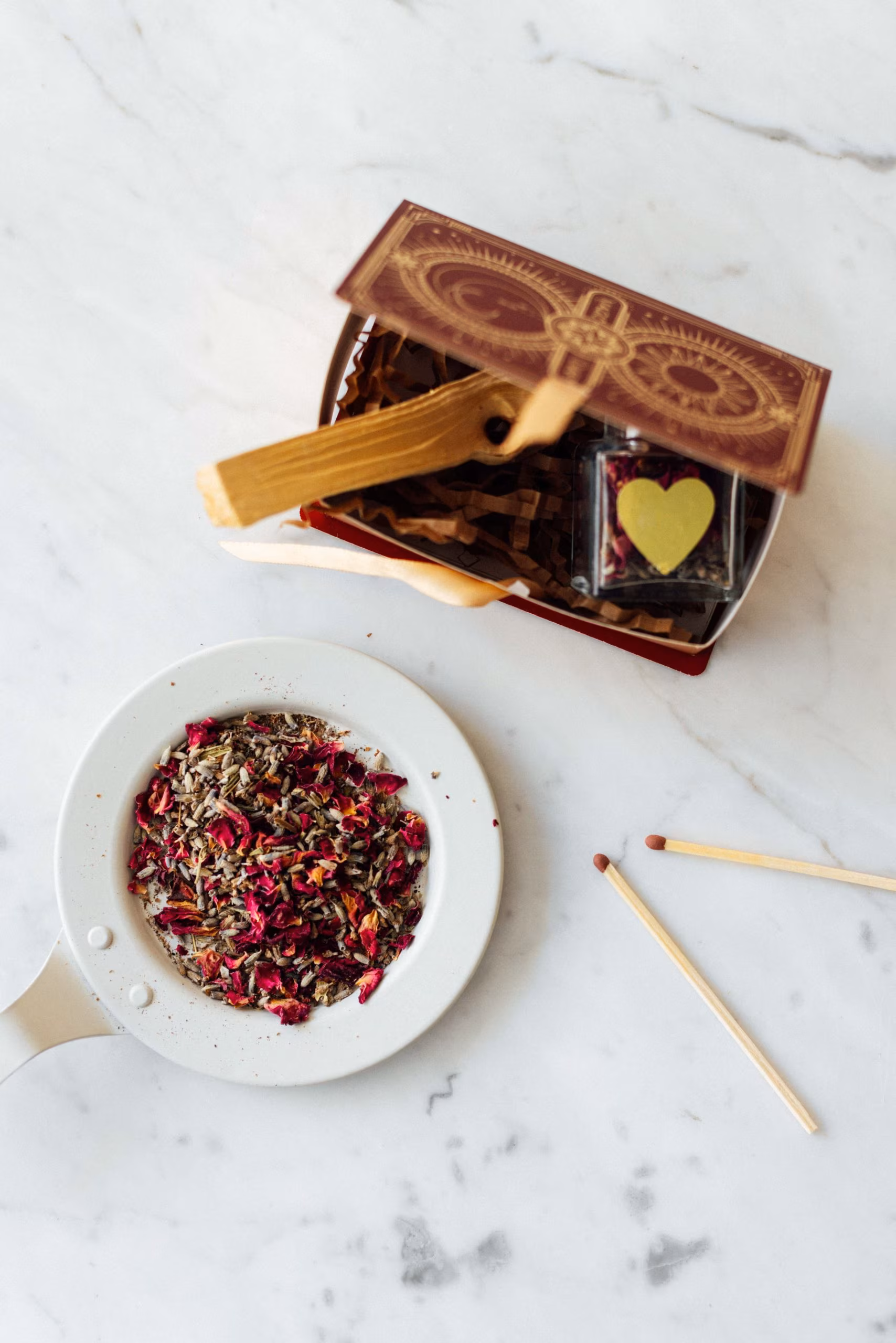 Cam kavanoz içerisinde love dust bitkisel tütsü ve 1 adet palo santo tütsüden oluşur.Bordo veya lacivert renk özel hediye kutusu içindedir.