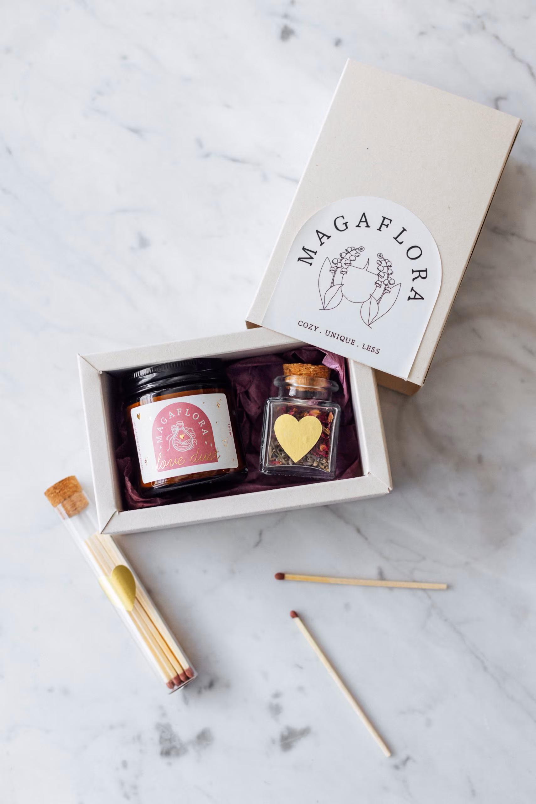 100 ml cam kavanoz içerisindeki love dust mum ve love dust bitkisel tütsüden oluşur.