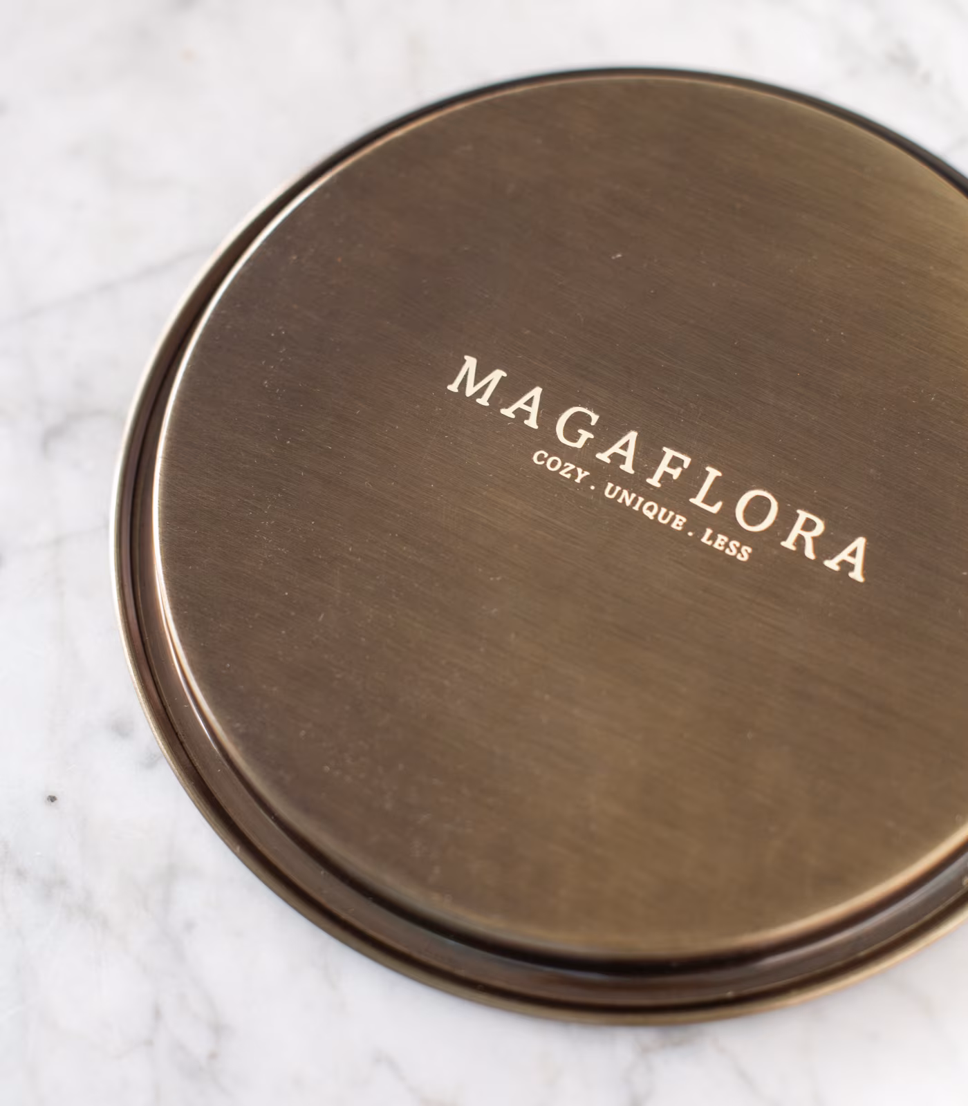 Sınırlı sayıda üretmiş olduğumuz pirinç tepsiler tamamen el yapımıdır. Pirinç malzeme elde okside edilerek eskitilmiştir. Oksidasyon işlemi elde yapıldığı için tabaklar arasında aralarında ufak renk koyuluğu farklılıkları olabilir. Maga Floranın tüm mumları, mum söndürücüleri ve sprey şişelerini bir arada kullanmak için altlık olarak tasarlandı. Ayrıca sunum tepsisi olarak da kullanabilirsiniz.
