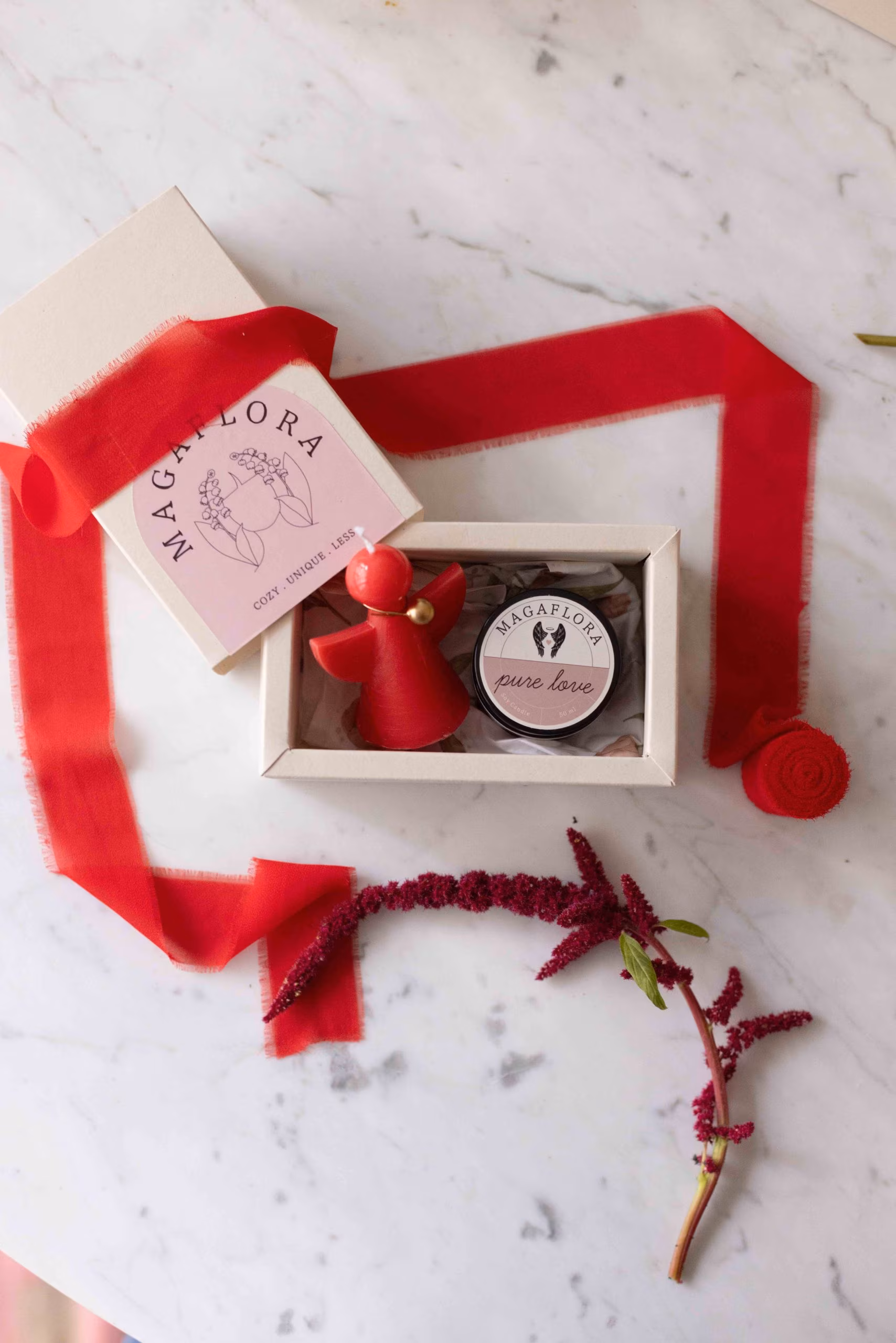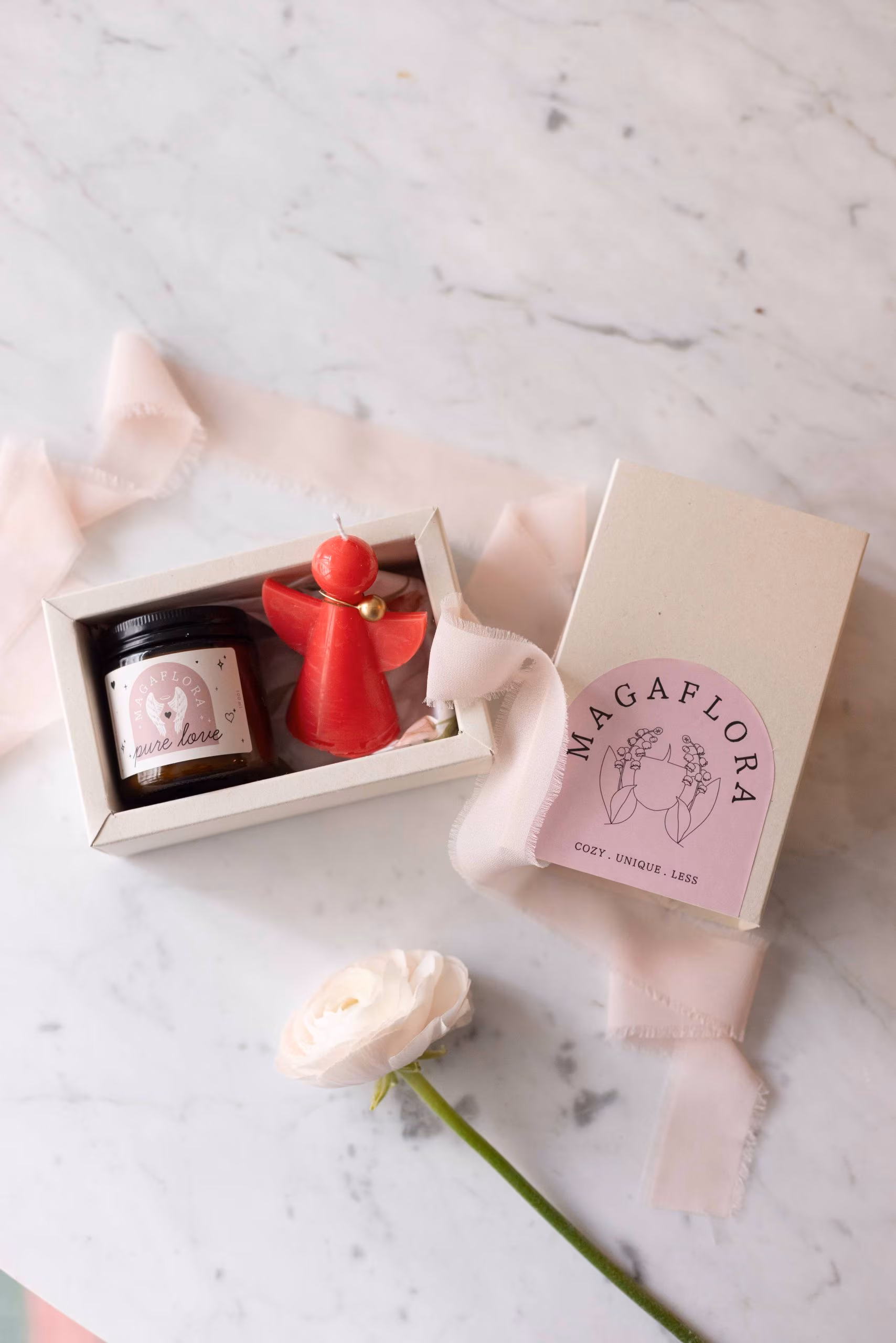 50 veya 100 ml cam kavanoz içerisindeki pure love mum ve küçük balmumu melekten oluşur. Melekler yeşil veya kırmızırenkte olabilir. Balmumu melekler el yapımı oldukları için renklendirmede ton farklılıkları olabilir.