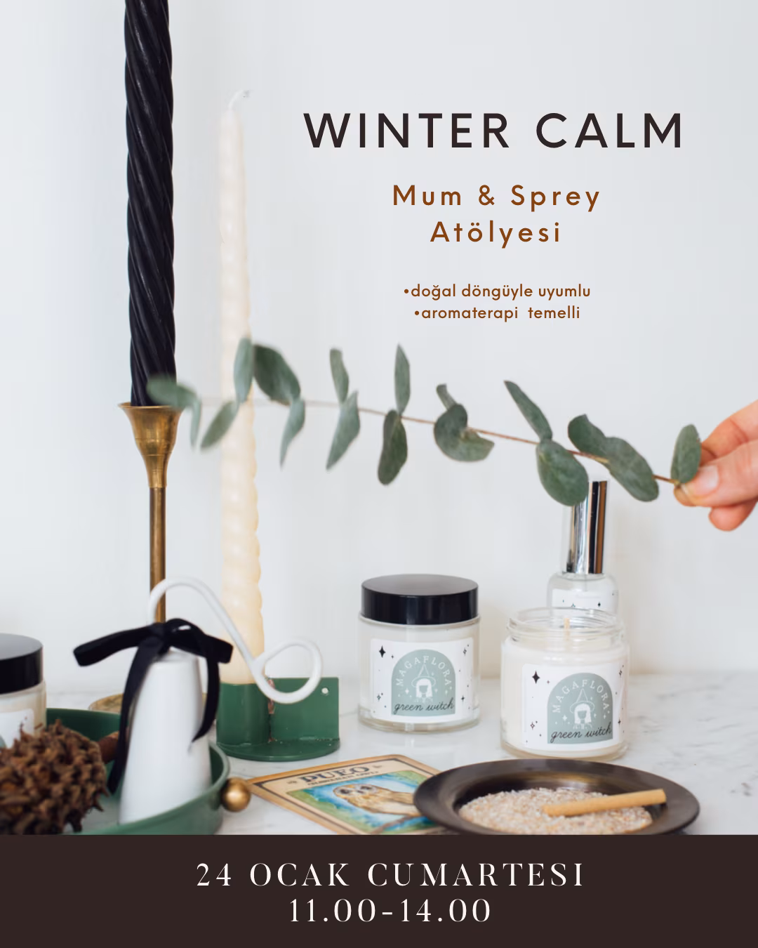 Winter Calm, kış mevsiminin yavaşlayan ritmine uyumlanan, aromaterapi temelli bir mum ve sprey atölyesidir. Atölye boyunca, mevsimsel döngü gözetilerek seçilmiş doğal ve bitkisel içeriklerle üretim yapılır.